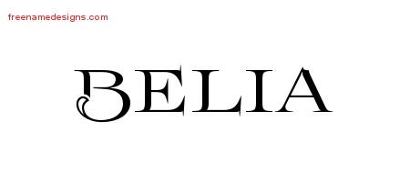 This free name graphic with flourishes lettering is printed with the custom name Belia.