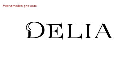 This free name graphic with flourishes lettering is printed with the custom name Delia.