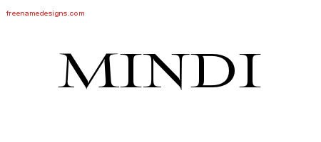 This free name graphic with flourishes lettering is printed with the custom name Mindi.